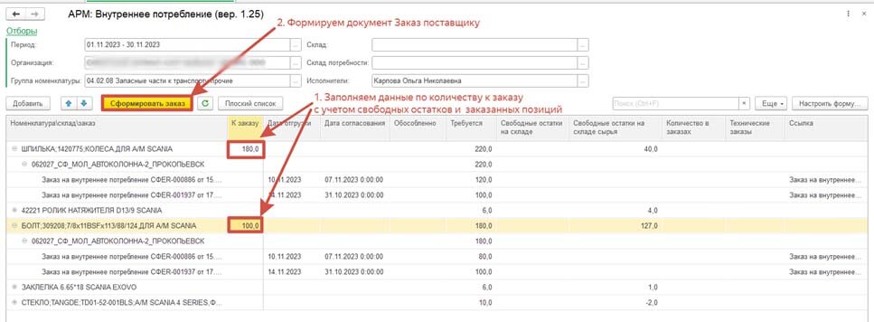 Для этого необходимо напротив каждой номенклатуры к заказу установить значение по количеству и выполнить команду Сформировать заказ.