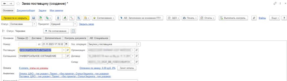 После согласования и утверждения счета на оплату, спецификации по заказу данный документ может быть изменен под фактические данные. Для этого достаточно изменить данные по закладке Основное и стоимости закупки. Открыть «технический» заказ можно непосредственно из АРМ или из журнала заказов поставщику.