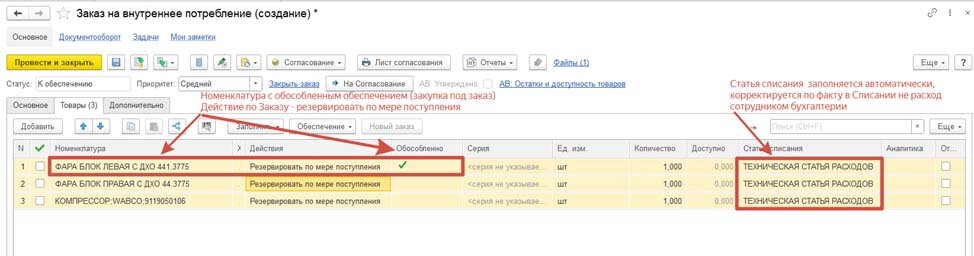 1. Регистрация потребности в ТМЦ от инициатора с использованием стандартного документа Заказ на внутреннее потребление товаров.