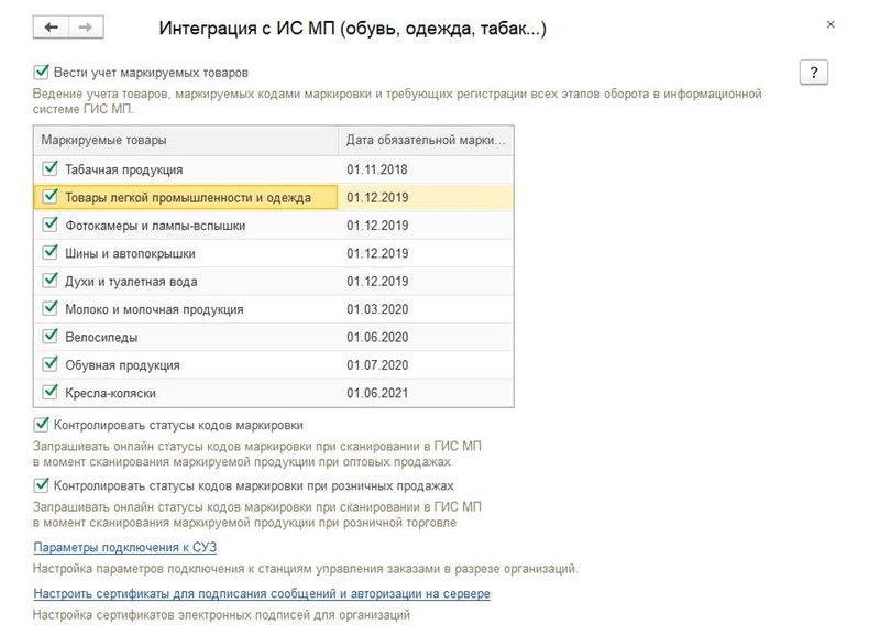 Существенным нововведением стало развитие учета маркируемой продукции, затронувшее все три блока. В системе выделены разделы «Обмен с ИС МП (обувь, одежда, табак)» и «Обмен с ГИСМ (изделия из меха)». Функционал ввода и вывода товаров из оборота, передачи кодов маркировки между организациями и их перемаркировки получил дальнейшее развитие.