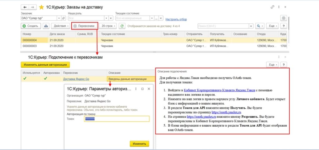 Для взаимодействия с перевозчиками и логистическими операторами через единый API планируется использование сервисов «1С:Курьер» и «1С:Доставка». Они позволяют оформлять доставку непосредственно из программы, контролировать процесс онлайн и получать актуальную информацию о перемещении груза. Поддерживается интеграция с «Яндекс.Такси» и «Деловые линии».