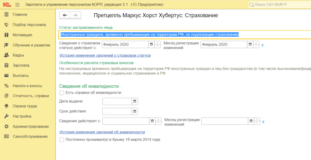В разделе «Страхование» необходимо выбрать один из вышеуказанных статусов иностранного работника в соответствии с его текущим положением